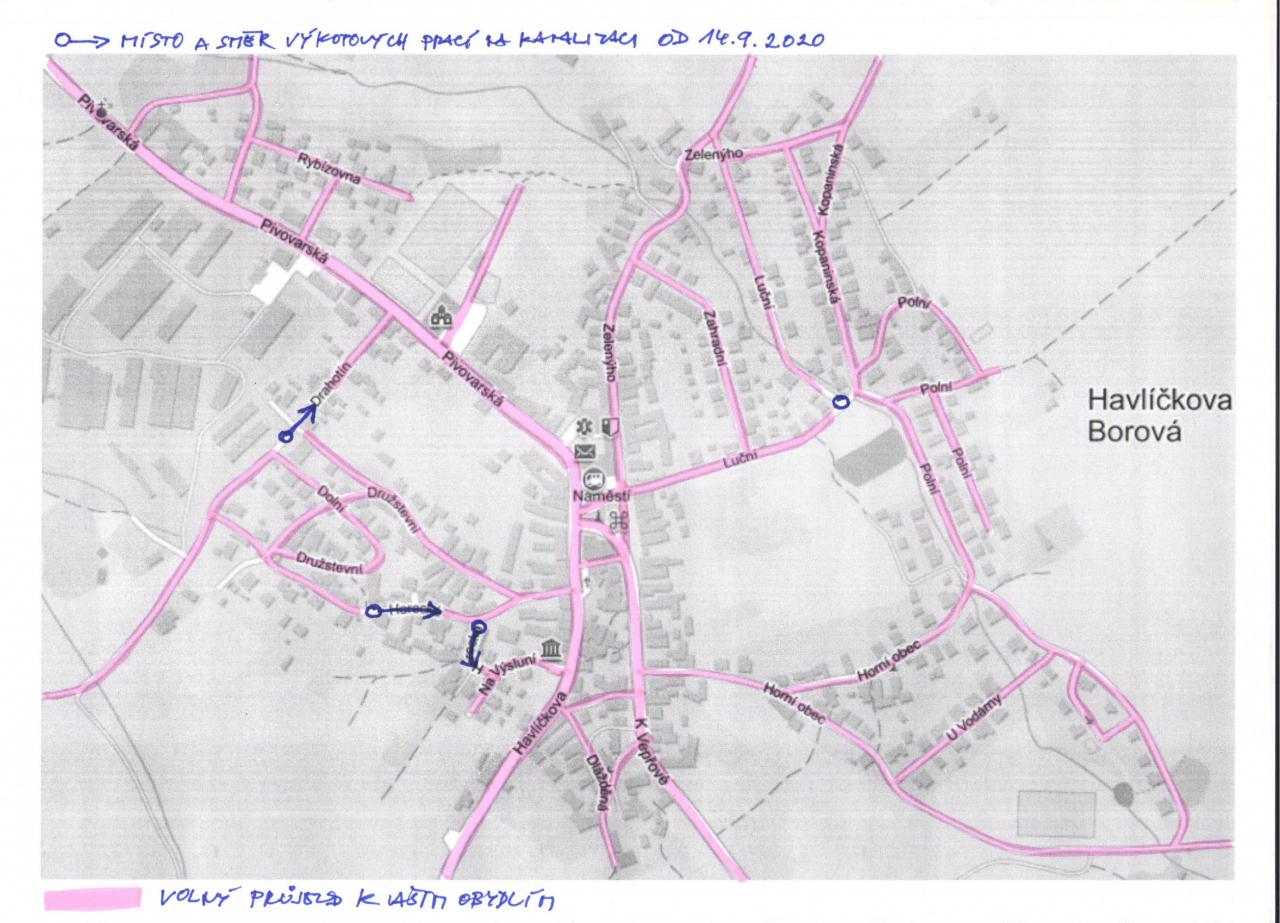 z důvodu postupujících prací (splašková kanalizace) došlo ke změně v průjezdnosti komunikací. Proto jsme aktualizovali mapový podklad s vyznačením míst a směrů výkopových prací a vyznačení komunikací a křižovatek, které budou průjezdné od 14. 9. 2020.
