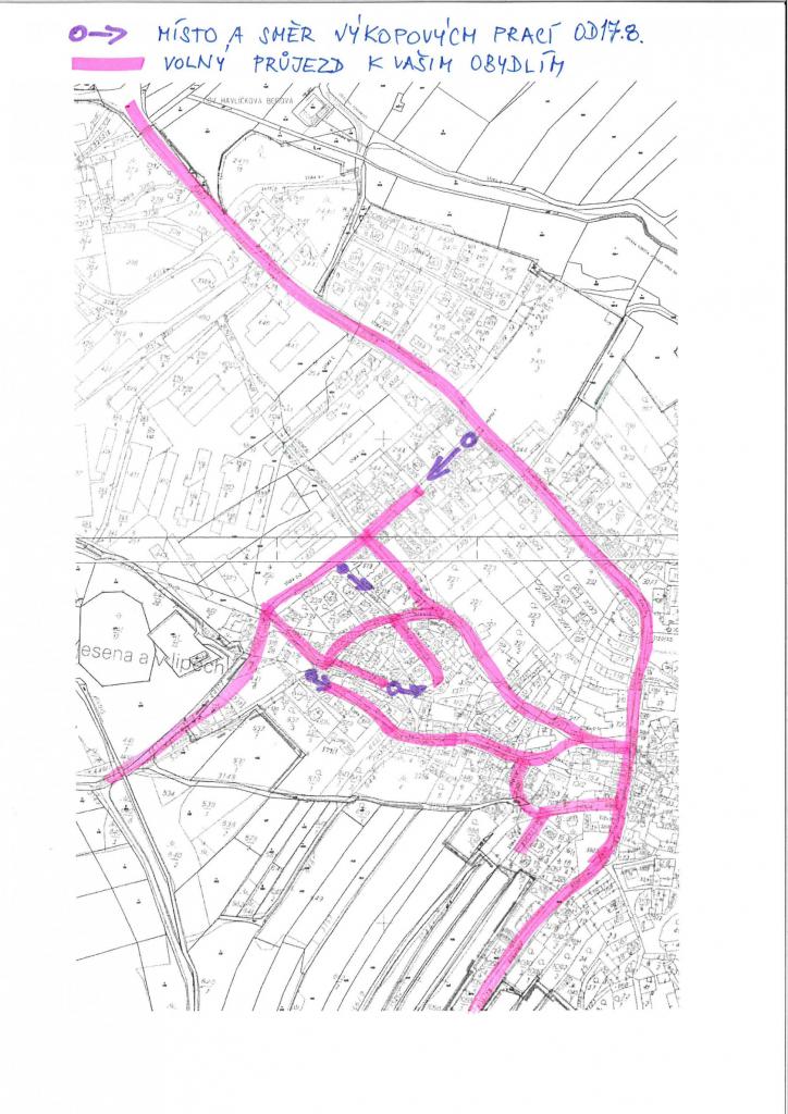 z důvodu postupujících prací došlo ke změně v průjezdnosti komunikací. Proto jsme aktualizovali mapový podklad s vyznačením míst a směrů výkopových prací a vyznačení komunikací a křižovatek, které budou průjezdné od 17. 8. 2020.