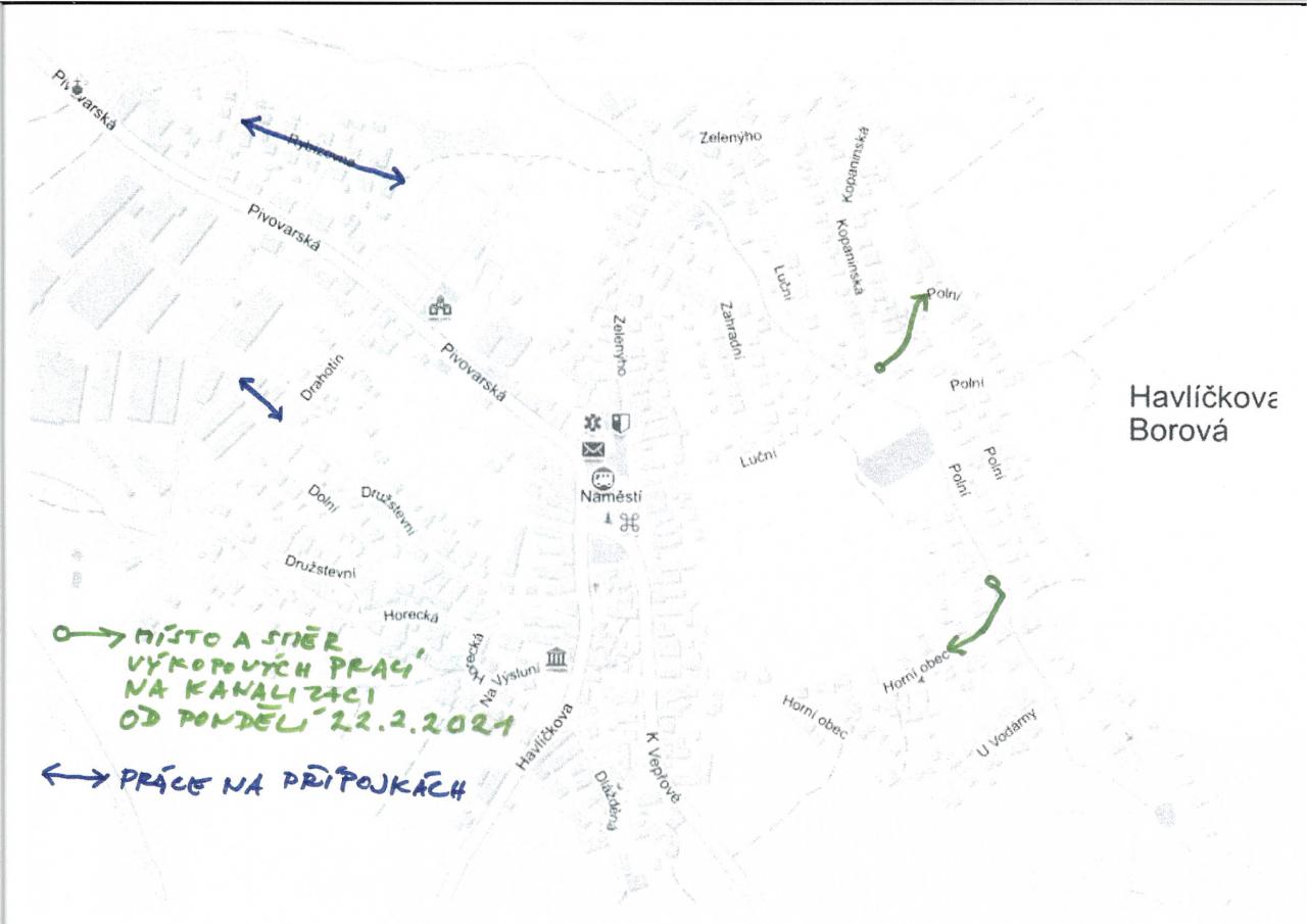 práce na výstavbě splaškové kanalizace budou pokračovat od pondělí 22. 2. 2021. V příloze situace s aktualizovaným postupem výkopových prací.