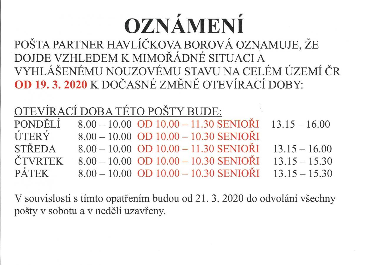 V souvislosti s tímto opatřením budou od 21. 3. 2020 do odvolání všechny pošty v sobotu a v neděli uzavřeny.
