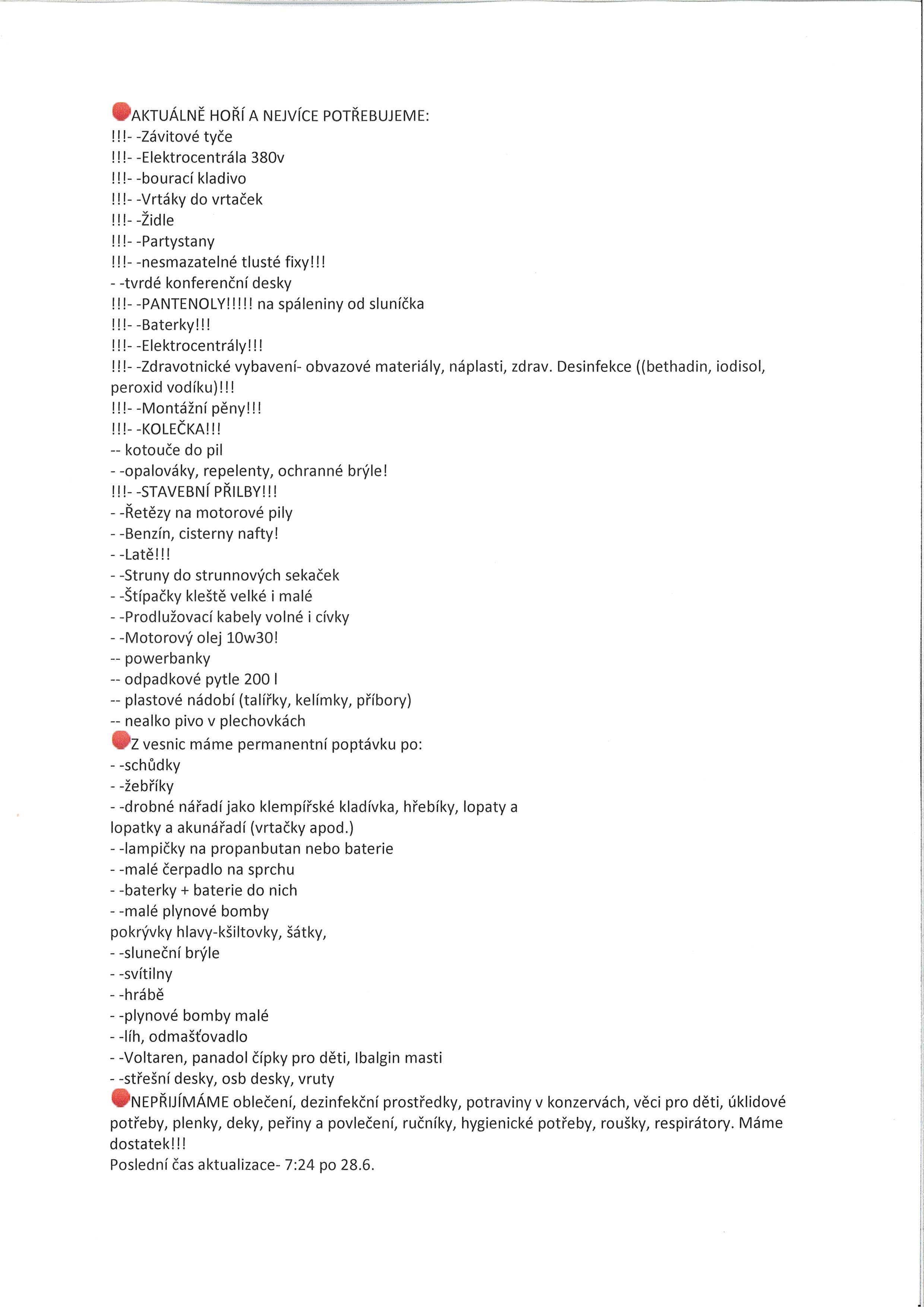 Materiální sbírka:NEPŘIJÍMÁME, co bylo deklarováno v pátek,NOVĚ PŘIJÍMÁME stavební materiál, st.přilby, zdravotnické vybavení, ochranné prostředky proti slunci, drobné nářadí, svítilny a baterky, malé plynové bomby, nealko pivo v plechovkách, motorový olej, hrábě, prodlužov. kabely