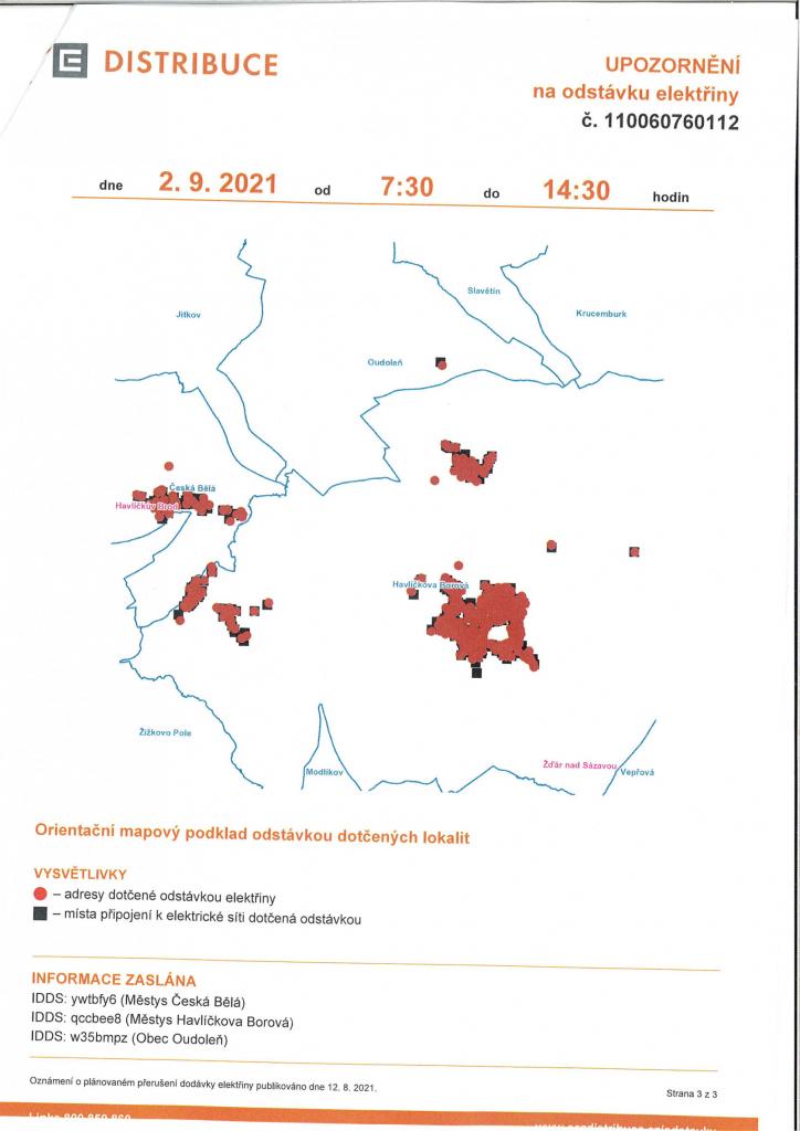 ČEZ Distribuce, a.s. informuje, že dne 2. 9. 2021 od 7:30 do 14:30 hodin dojde k přerušení dodávky elektrické energie v Havl. Borové, Peršíkově a Železných Horkách, a to z důvodu prací na distribuční soustavě.
