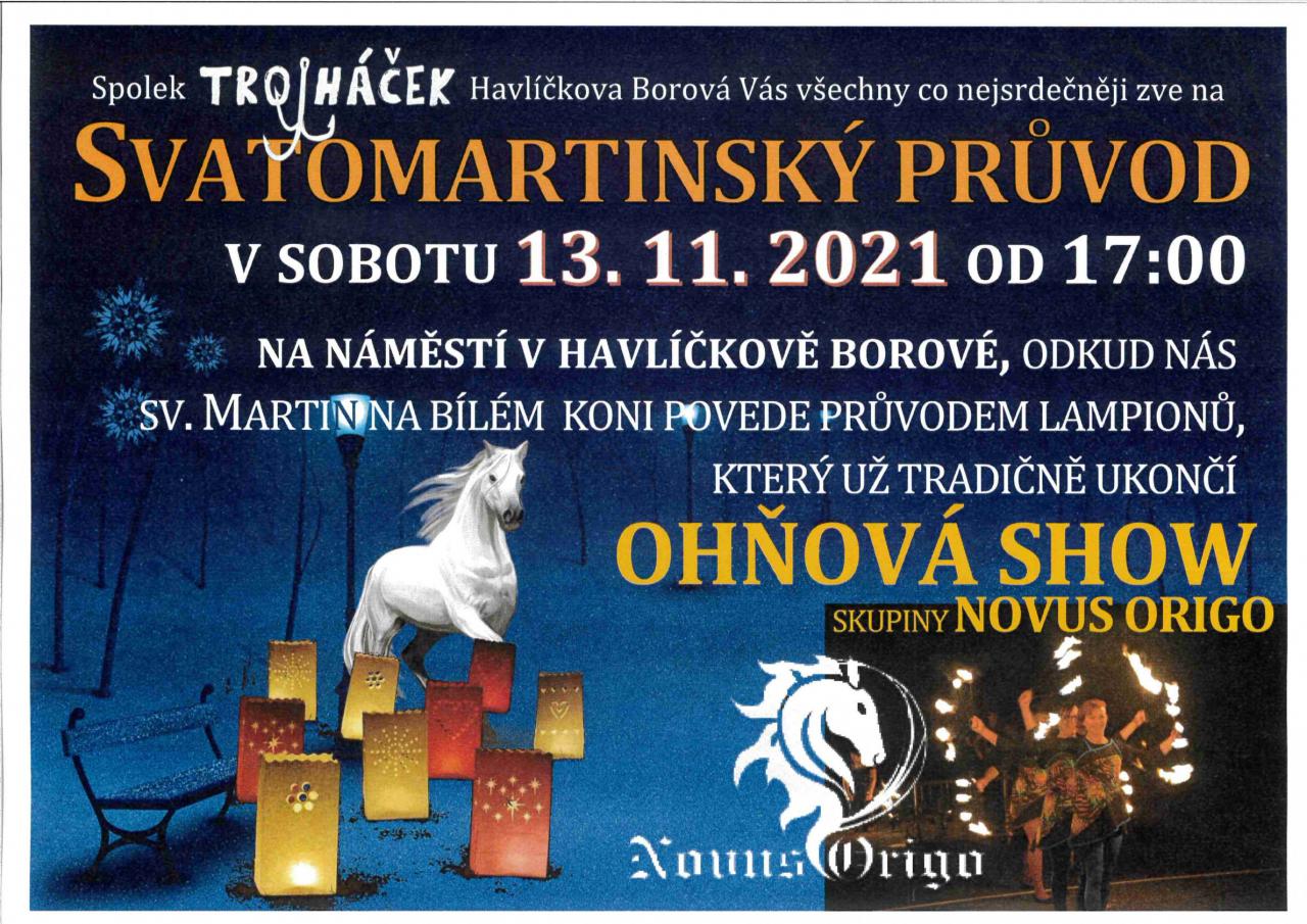 Spolek TrojHáček Havl. Borová Vás všechny srdečně zve na Svatomartinský průvod, který se uskuteční v sobotu 13. 11. 2021 od 17 hodin na Náměstí v Havl. Borové, odkud nás sv. Martin na bílém koni povede průvodem lampiónů, který už tradičně ukončí ohňová show.