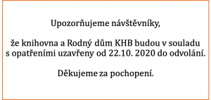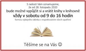 Budeme se na vás těšit v knihovně každou sobotu od 9 do 16 hodin. Využijte proto možnost vrátit a půjčit si knihy. Ovšem samozřejmě Vás prosíme o dodržování opatření.