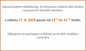 Upozorňujeme návštěvníky, že knihovna a Rodný dům budou z provozních důvodů uzavřeny ve středu 15. 5. 2019 celý den. Děkujeme za pochopení a těšíme se na Vaší návštěvu v jiné dny.
