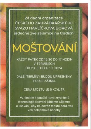 Základní organizace Českého zahrádkářského svazu Havlíčkova Borová srdečně zve zájemce na tradiční MOŠTOVÁNÍ. Každý pátek od 15:30 do 17 hodin v termínech od 23. 8. do 4. 10. 2024. Cena moštu je 6 Kč/litr.