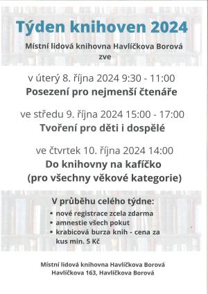 Místní lidová knihovna Havlíčkova Borová zve od úterý 8. října do čtvrtka 10. října na posezení pro nejmenší čtenáře, tvoření pro děti i dospělé. Přijďte si do knihovny vypít kafíčko.