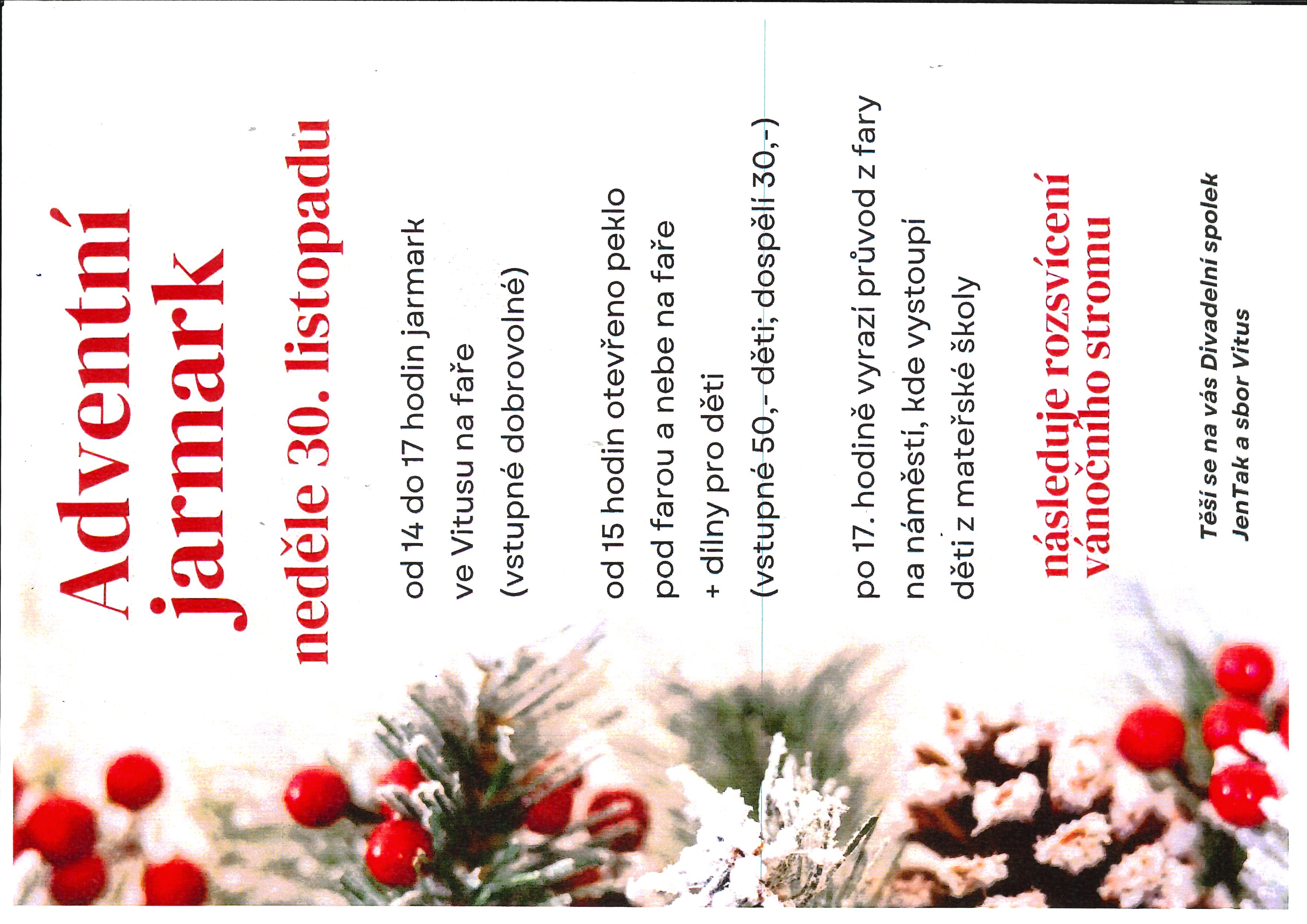 V neděli 30. listopadu 2025 se v areálu fary uskuteční adventní jarmark. Na faře bude pro děti i peklo a nebe, i tvořivé dílny. Po skončení programu na faře si poslechneme píseň od sboru Vitus a průvodem se přesuneme na náměstí, kde s dětmi ze školky rozsvítíme vánoční strom na náměstí.