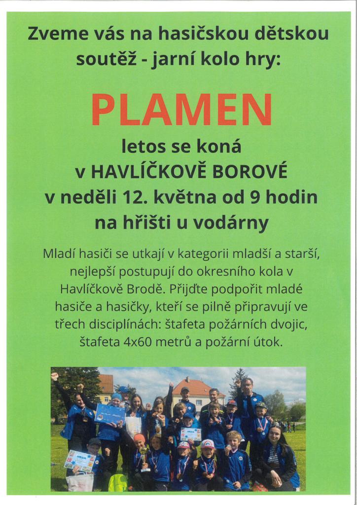 Přijměte pozvání na jarní hasičskou dětskou soutěž PLAMEN, která se koná letos v Havlíčkově Borové v neděli 12. května od 9 hodin na hřišti U VODÁRNY.