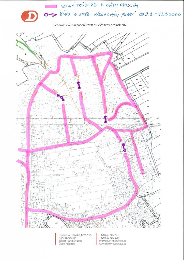 z důvodu postupujících prací došlo ke změně v průjezdnosti komunikací. Proto jsme aktualizovali mapový podklad s vyznačením míst a směrů výkopových prací a vyznačení komunikací a křižovatek, které budou průjezdné - 9. 3. - 13. 3. 2020.