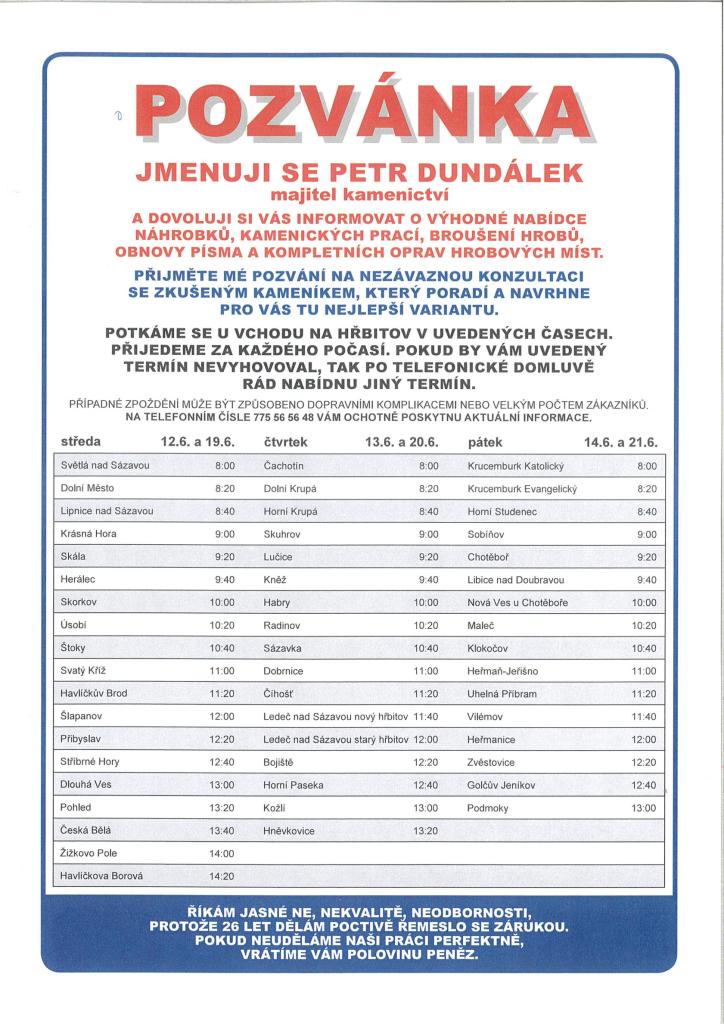 Kameník Petr Dundálek z Kamenosochařství Gerhard Vás zve na místní hřbitov v Havlíčkově Borové ve středu 19. 6. od 14:20 do 14:30. Představíme Vám naši nabídku za výhodné ceny. Prohlédněte si naši práci, získejte katalog pomníků. Vše nezávazně a zdarma.