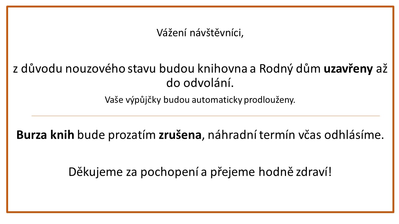 Burza knih zrušena, náhradní termín včas ohlásíme.