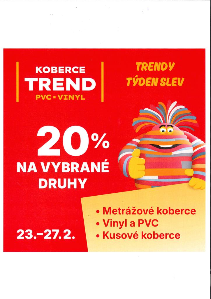 Prodejna Havlíčkův Brod vás zve na Trendy týden slev od 23. do 27. února. Získejte 20% slevu na vybrané metrážové koberce, vinyl, PVC i kusové koberce. Těšíme se na vás v prodejně Koberce Trend v Havlíčkově Brodě křižovatka u Bily.