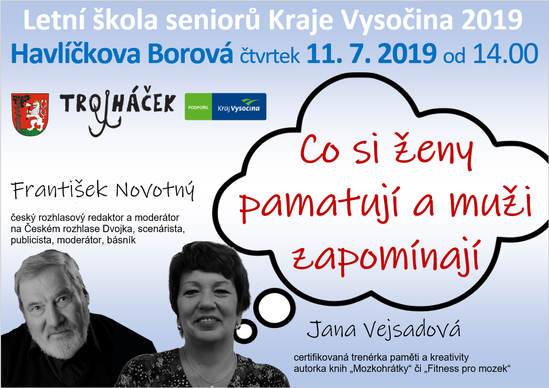 Spolek TrojHáček Vás všechny (nejen seniory) srdečně zve na další přednášku z Letní školy seniorů, tentokrát na téma: Co si ženy pamatují a muži zapomínají s Františkem Novotným a Janou Vejsadovou.