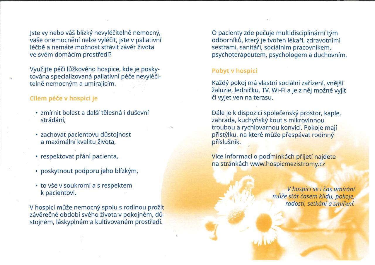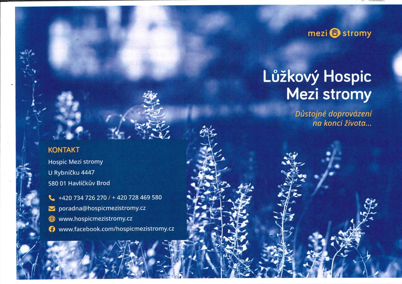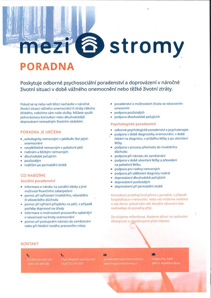 Hospic Mezi stromy nabízí specializovanou paliativní péči nevyléčitelně nemocným, poskytuje odborné psychosociální poradenství a doprovázení v náročné životní situaci v době vážného onemocnění nebo těžké životní ztráty.