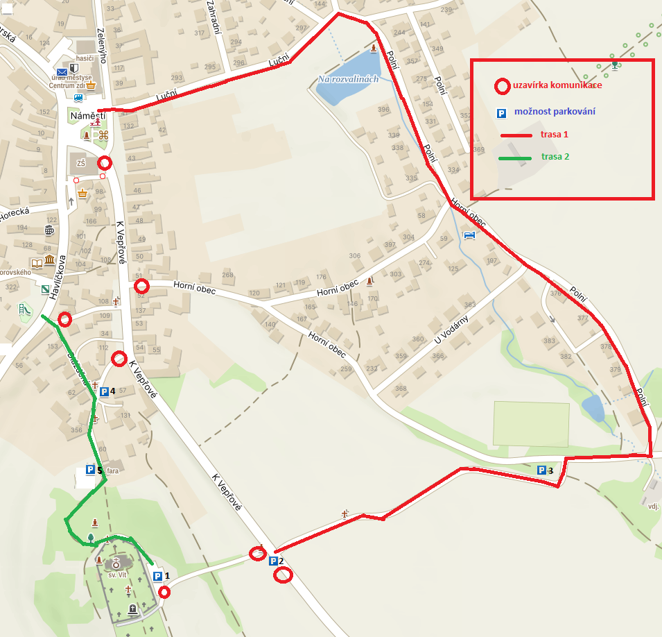 Pro přístup na hřbitov lze využít dvě trasy. Trasu 1: z Havlíčkovi ulice, ulicí Dlážděnou, kolem fary na parkoviště u hřbitova. Zde je možné dále zaparkovat na louce před farou, nebo na parkovišti pod farou. Další přístup je možný po trase 2. Z náměstí ulicí Luční, dále pak Polní, přes Horní obec až k silnici k Vepřové. Zde je možné zaparkovat na dvou místech. Děkujeme za pochopení.