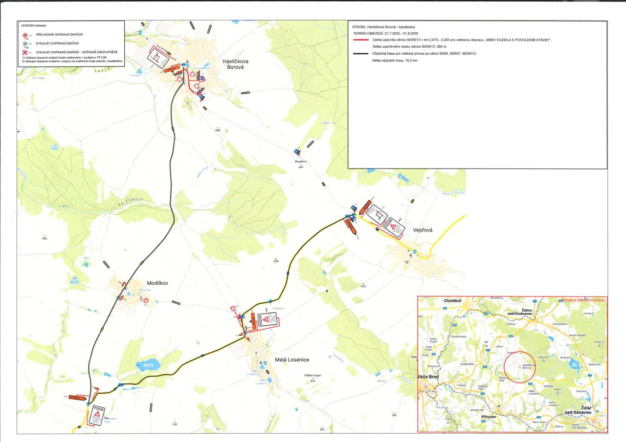 Městský úřad Havlíčkův Brod oznamuje stanovení přechodné úpravy provozu na vybraných místních komunikacích v Havlíčkově Borové a v Modlíkově. Umístění je povoleno na akci "Havlíčkova Borová - kanalizace" v termínu od 21.07.2025 do 31.08.2025.