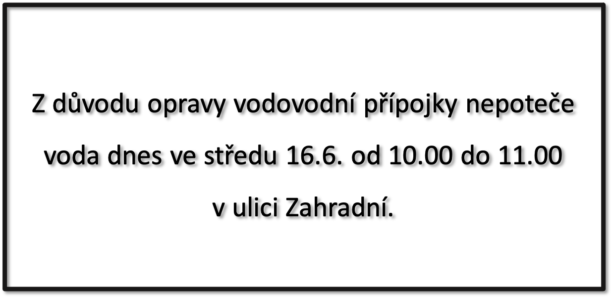 Z důvodu opravy vodovodní přípojky nepoteče voda dnes ve středu 16.6. od 10.00 do 11.00 v ulici Zahradní.