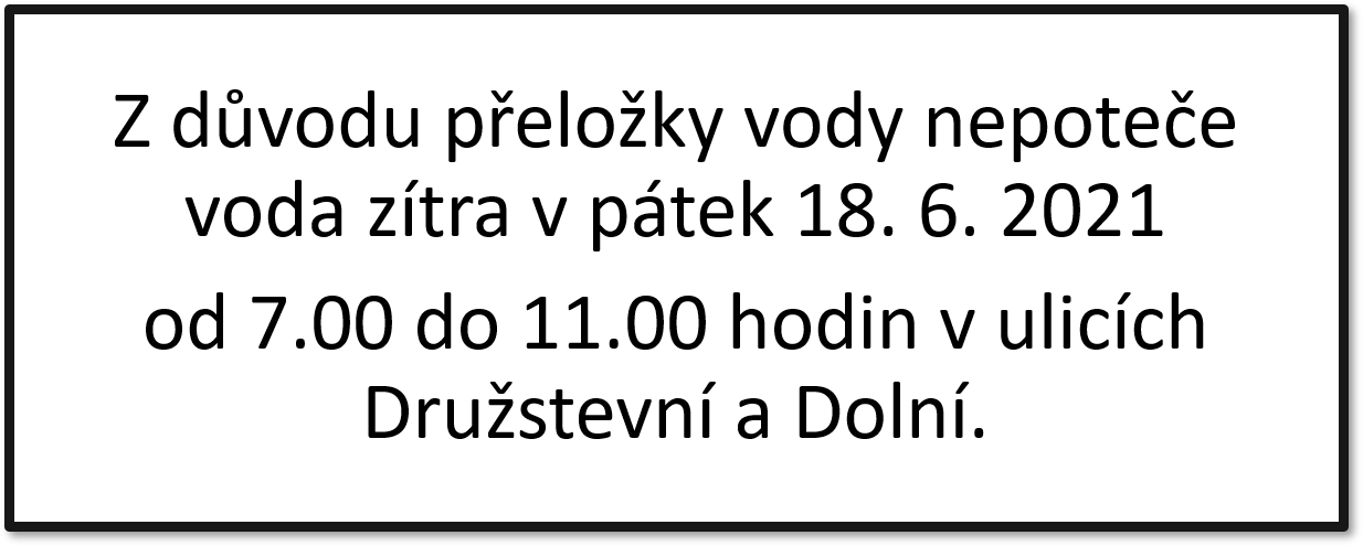 Z důvodu přeložky vody nepoteče voda zítra v pátek 18. 6. 2021 od 7.00 do 11.00 hodin v ulicích Družstevní a Dolní.