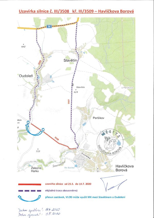 Z důvodu opravy komunikace bude uzavřena komunikace č. III/3508 (chotěbořská silnice od "Pivára" po křižovatku na Oudoleň III/3509 od 25.5. do 10.7. 2020. Objízdná trasa bude vedena přes Oudoleň a Slavětín.