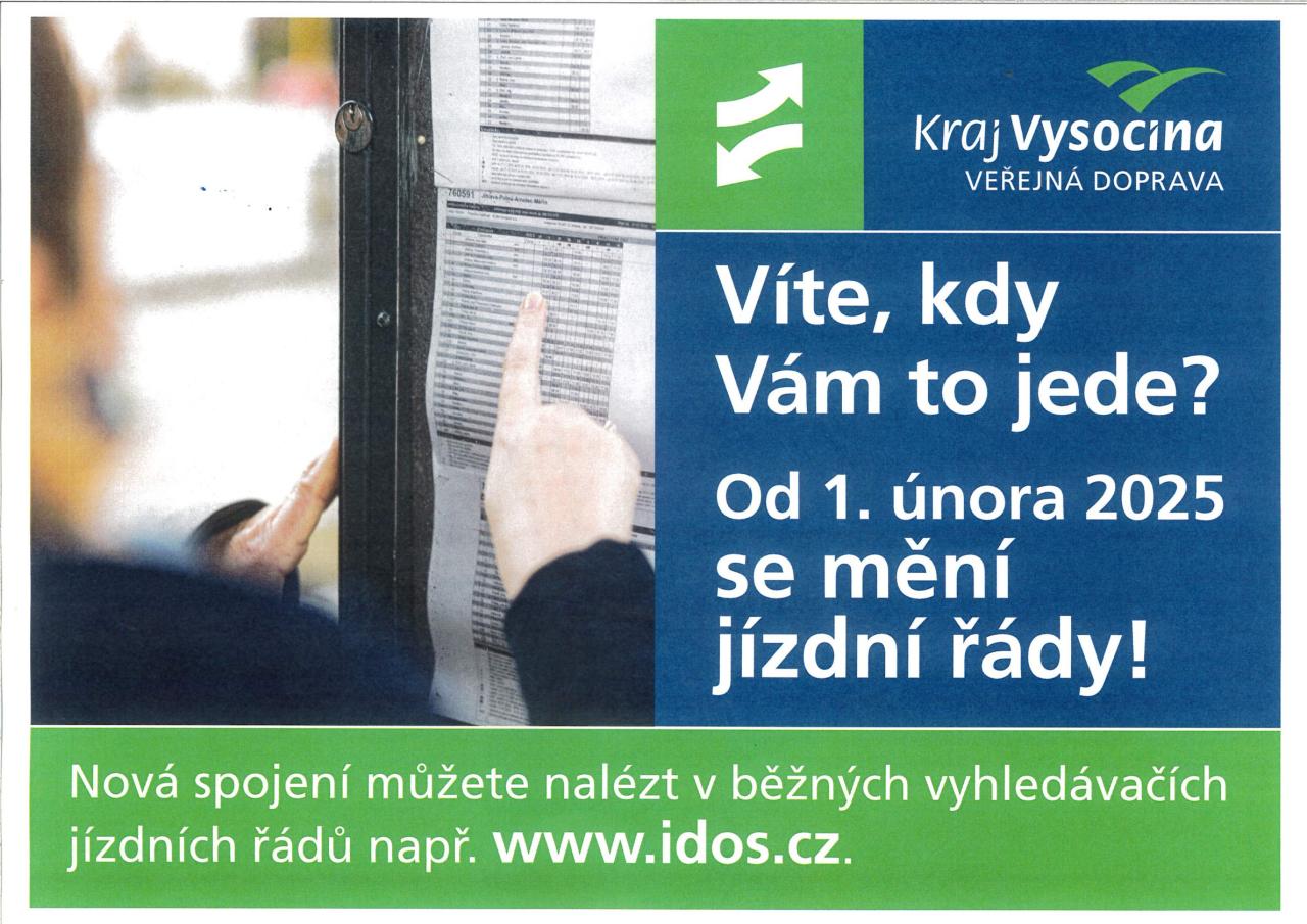 Autobusové linky Veřejné dopravy Vysočiny budou v novém roce přecházet pod nové dopravce, tím dojde k velkým změnám v jízdních řádech. Změna v naší obci nastane 1. 2. 2025. Nové časy odjezdů můžete najít ve vyhledávačích spojení (např. IDOS.cz) po zadání únorového data.