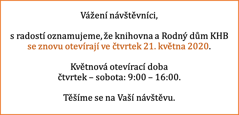 Vážení návštěvníci, s radostí oznamujeme, že knihovna a Rodný dům KHBse znovu otevírají ve čtvrtek 21. května 2020. Květnová otevírací doba je čtvrtek – sobota: 9:00 – 16:00.Těšíme se na Vaší návštěvu.