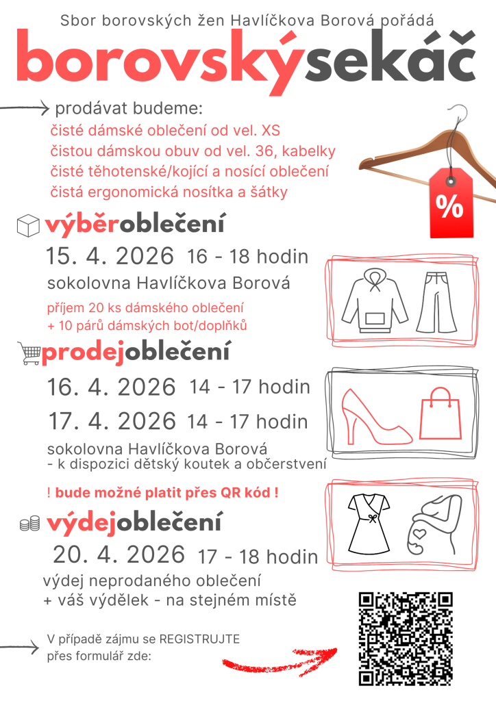 Sbor borovských žen zve na DÁMSKÝ SEKÁČ do havlíčkoborovské sokolovny ve dnech 16. a 17. dubna 2026 mezi 14 a 17 hodinou.