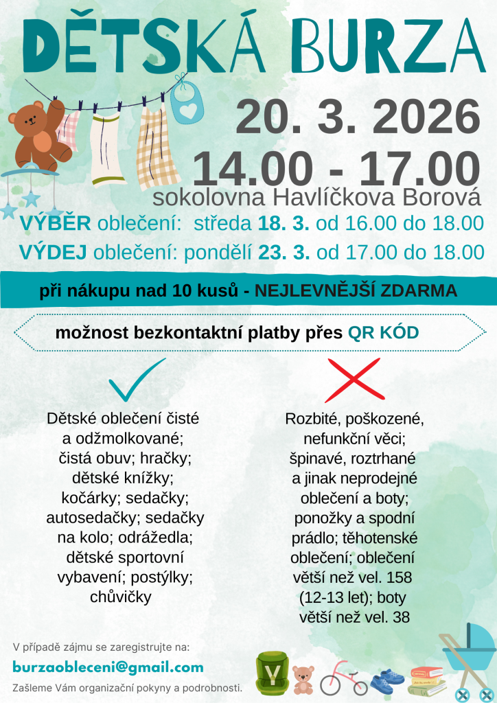 Sbor borovských žen vás zve na Dětskou burzu do sokolovny a to v pátek 20. března 2026 mezi 14 a 17 hodinou.
