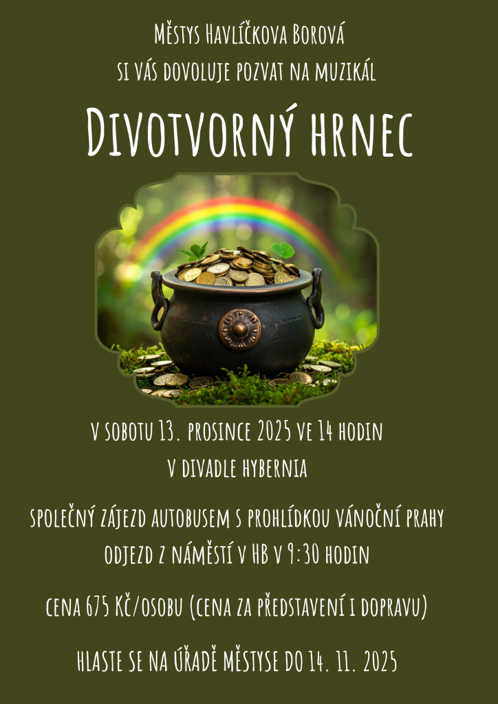 Městys Havlíčkova Borová pořádá zájezd do Prahy na muzikál Divotvorný hrnec v sobotu 13. prosince - pouze pro přihlášené.