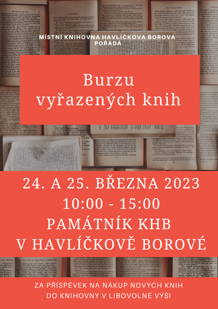Zveme vás na jarní burzu vyřazených knih do knihovny - v pátek 24. a v sobotu 25. března 2023, vždy mezi 10 a 15 hodinou. Svým nákupem podpoříte nákup nových knih do knihovny.