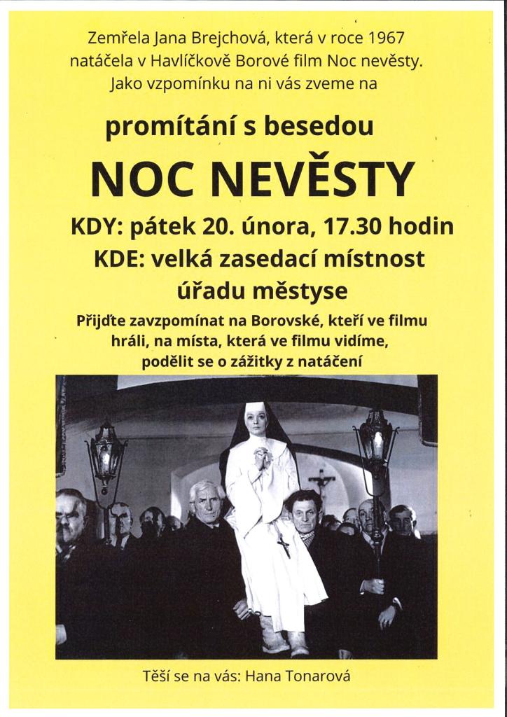 Hana Tonarová vás srdečně zve v pátek 20. února 2026 v 17:30 do horní zasedací místnosti úřadu městyse na promítání filmu Noc nevěsty, která bude pokračovat besedou.