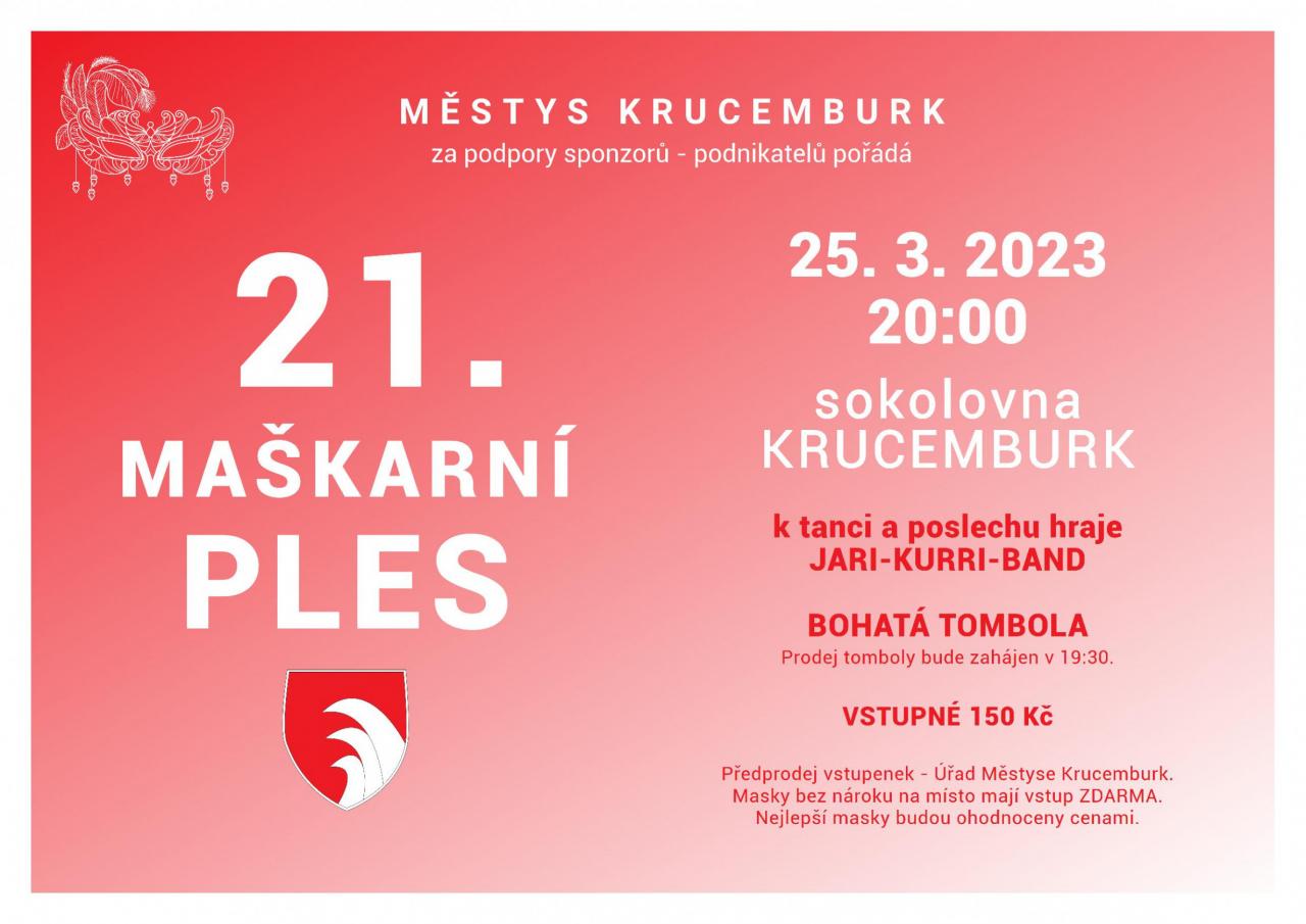 Městys Krucemburk za podpory sponzorů - podnikatelů pořádá 21. MAŠKARNÍ PLES - dne 25. 3. 2023 ve 20. hod. v sokolovně v Krucemburku.