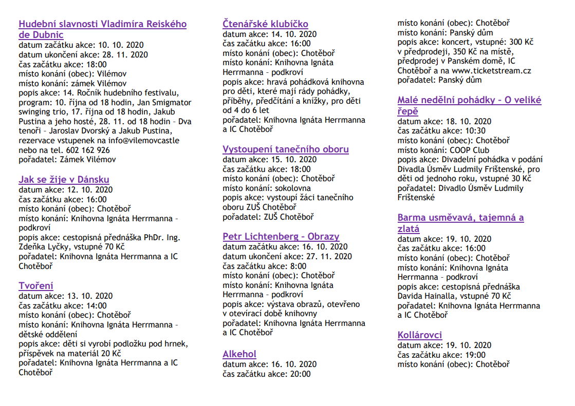Přehled kulturních akcí Chotěboř - říjen 2020