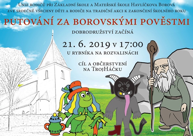 Unie rodičů při ZŠ a MŠ Havlíčkova Borová zve srdečně všechny děti a rodiče na tradiční akci k zakončení školního roku. Dobrodružství začíná 21. 6. 2019 v 17°° hodin u Rybníka na Rozvalinách.