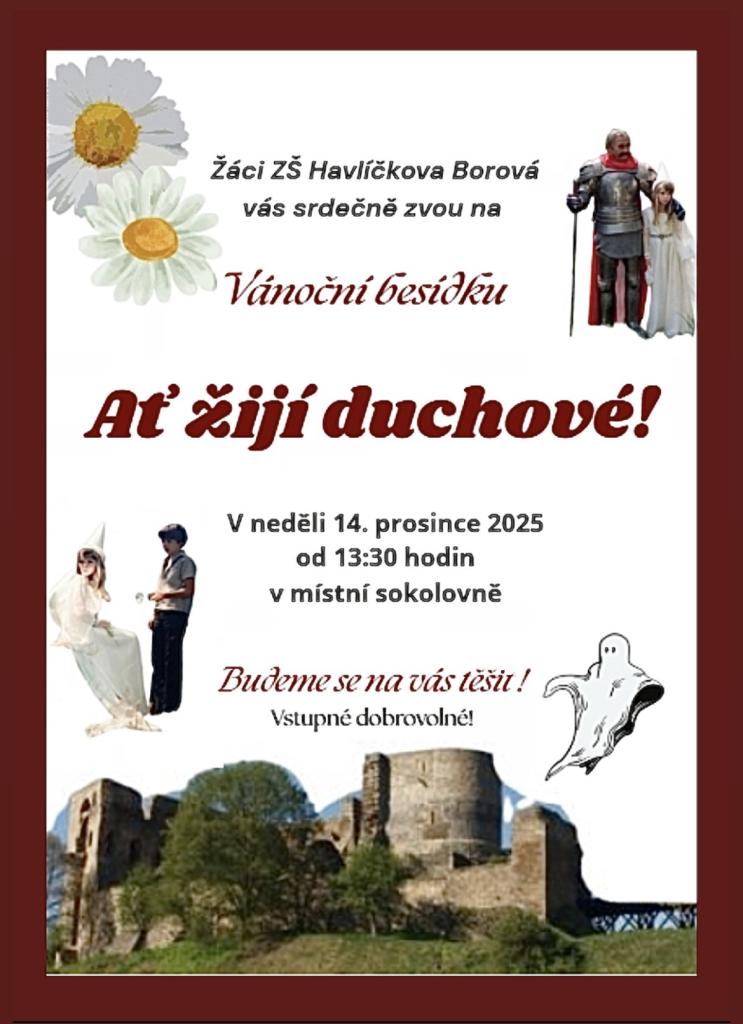 V neděli 14. prosince ve 13:30 vás žáci ZŠ Havlíčkova Borová zvou do sokolovny na vánoční besídku Ať žijí duchové!