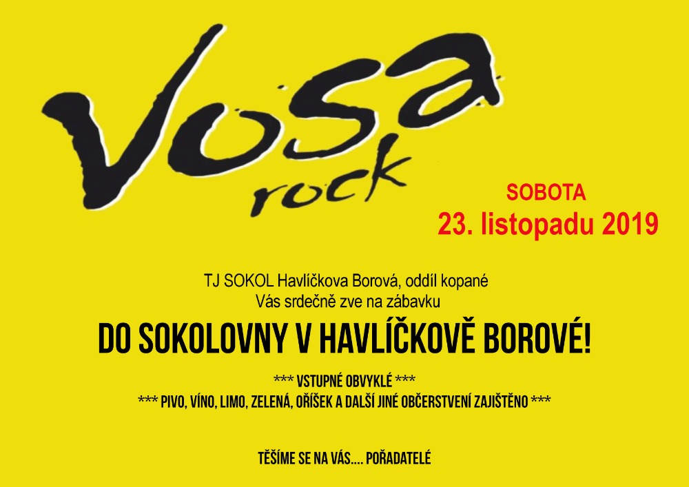 TJ SOKOL Havlíčkova Borová, oddíl kopané Vás srdečně zve na zábavu 23. listopadu 2019 do sokolovny v Havlíčkově Borové. Těšíme se na Vás, pořadatelé.
